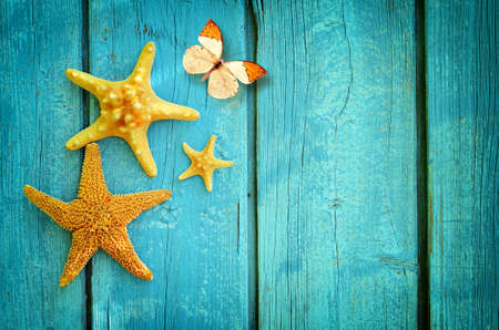 Summer beach. Starfish and butterfly on the blue wooden background.Summertime. Summer concept.