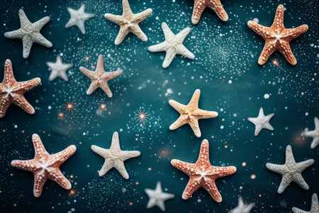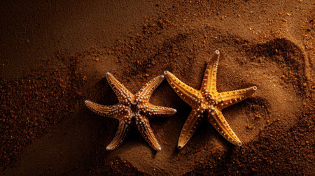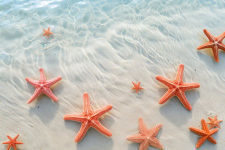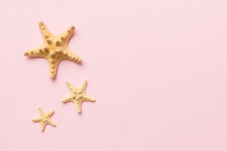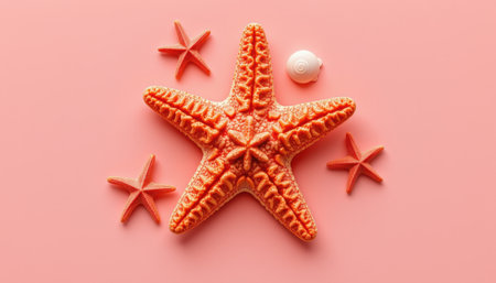 Starfish on sand in flat lay style, showcasing vibrant colors and unique textures. serene arrangement evokes sense of calm and connection to nature beauty