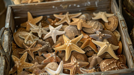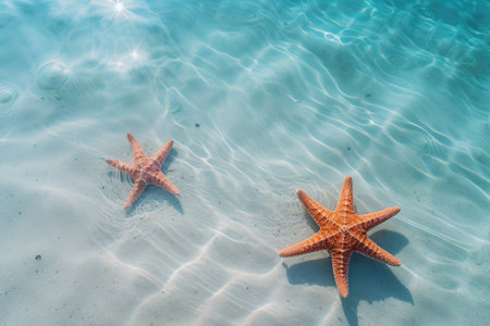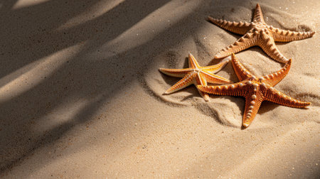 Starfish resting on soft sand, showcasing vibrant colors and intricate textures, evoke serene beach atmosphere. warm tones and gentle shadows create peaceful summer vibe