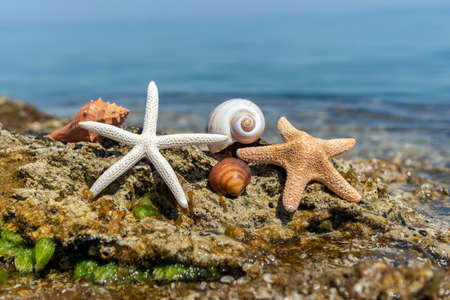 The concept of seaside holidays. Seashells and starfish on the sand by the sea. Background for summer holidays. A copy of the text location.