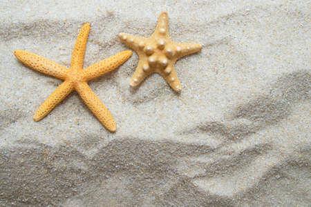 Two colorful starfish, star on sand beach with sea water background. couple vacation concept