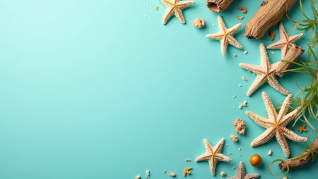 Tranquil turquoise sea background with scattered starfish driftwood and seaweed