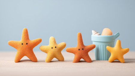This charming image features a trio of playful starfish in warm colors, set against a light blue background. A cute container adds a beachy touch with decorative shells.