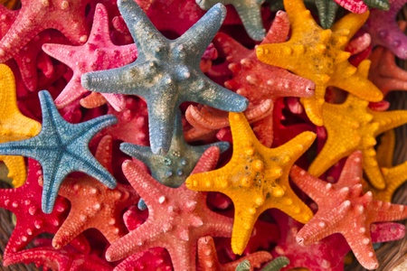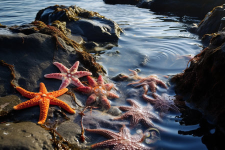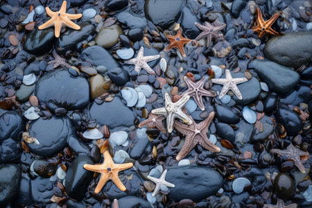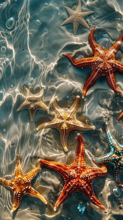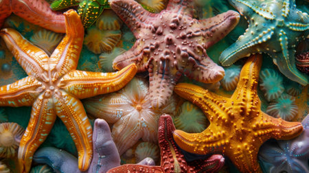 Many colorful starfish and seashells creating a vibrant underwater scene, perfect for nature and ocean related projects