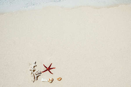 Starfish, shells on the sand on the shore of the Indian Ocean. Maldives islands.