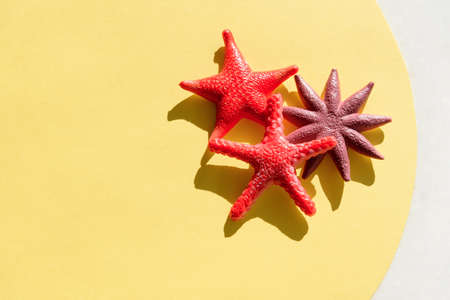 Summer background of yellow and blue paper with starfish, symbolizing the sea coast
