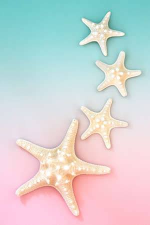 Starfish seashell creative background on pastel pink and blue. Abstract minimal summer heavenly composition. Flat lay, top view, copy space.