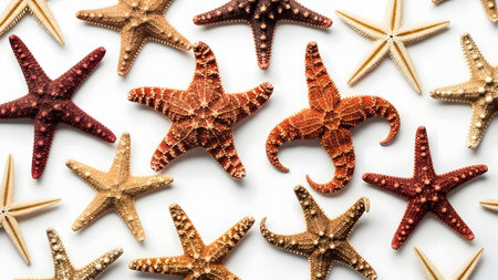 A collection of various starfish species arranged in a pattern on a white background. The assortment showcases different colors, sizes, and textures of these marine invertebrates.
