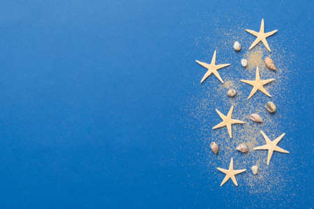 Summer time concept Flat lay composition with beautiful starfish and sea shells on colored table, top view with copy space for text.