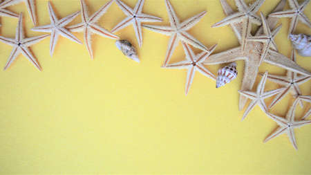 Seashells and starfish on yellow background. flat lay. copy space Vacation holiday concept. Summer background