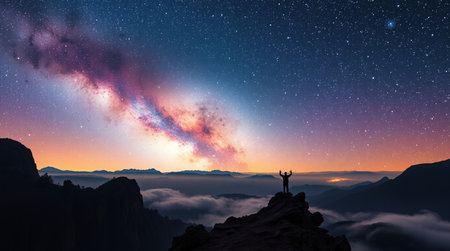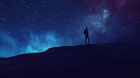 Concept photo of a person gazing up at a starry night sky, with the Milky Way galaxy stretching above them. The vastness of the universe and the persons small presence signify the grandeu