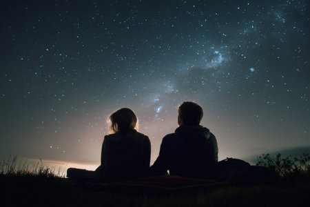 Romantic couple sitting on a blanket, gazing at the Milky Way and enjoying the tranquility of a starry night sky filled with wonder