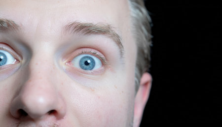 A close-up portrait of a surprised person with wide eyes and an open mouth, capturing genuine astonishment and emotion. The intense expression evokes curiosity and engagement.