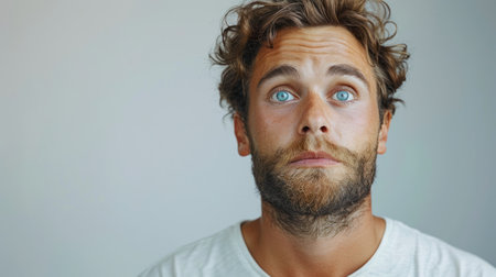 Portrait of adult bearded man with emotion of saddness on face looking at camera