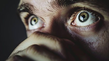 Close-up of a man with hands on his face, eyes wide in shock and fear, capturing an intense emotional reaction.