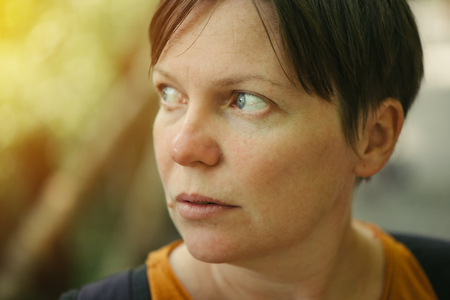 Close up of face of an adult caucasian female with backpack enjoying a walk in the park on sunny summer afternoon. Healthy lifestyle, recreation and nature loving concept.