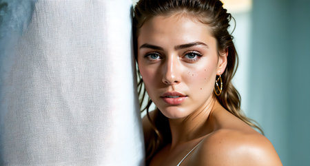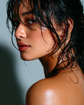 A young woman stands confidently in soft lighting, her wet hair framing her face. Her skin glistens, highlighting her natural beauty. The neutral background adds focus to her expression and features.