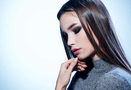 Pretty lady with dark hair on a light background and a gray sweater makeup