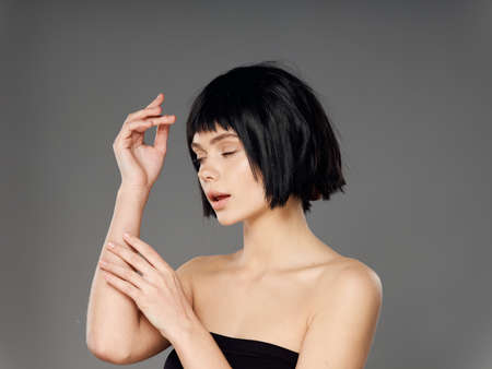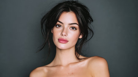 brunette with bare shoulders glamor cosmetics luxury gray background