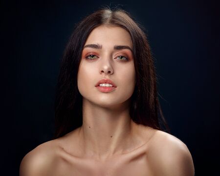 Beautiful woman with brown hair. Attractive model with brown eyes. Fashion model with a smokey makeup. Closeup portrait of a pretty woman looks at camera.