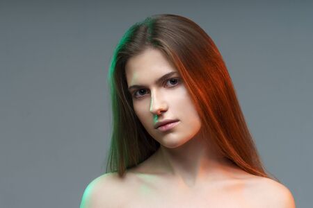 serious beautiful young woman with bare shoulders looking aside on multicolor background, closeup portrait
