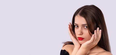 Banner, gray background with plenty space for cosmetic ads. Feminine style. Beautiful serious brunette woman with red lips, makeup on her face and hairstyle in a black top blouse.