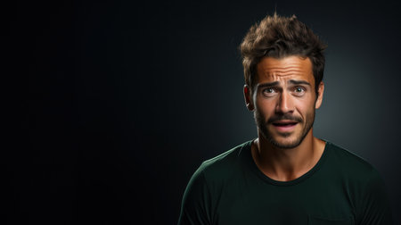 Portrait of a confused young man on a dark background looking at the camera.