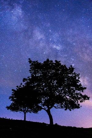 Silhouette of a beautiful tree at night. Monte Erlaitz in the town of Irún, Guipuzcoa. Basque Country. Night photography of the Milky Way in June