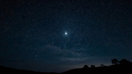 A star-filled night sky with the visible structure of the Milky Way galaxy over the silhouette of rolling hills.