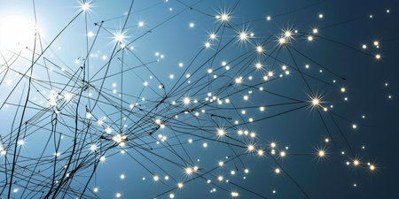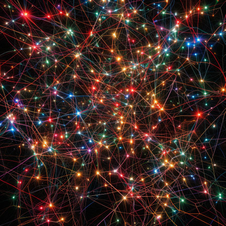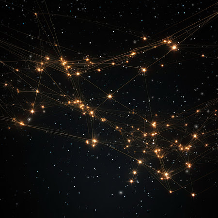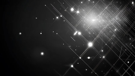 A mesmerizing display of a collection of bright lights shining in the darkness, creating a captivating and enchanting atmosphere against a backdrop of dots and lines.