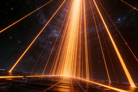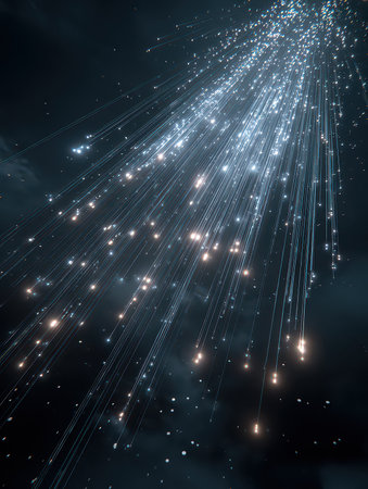 An artistic representation features streams of glowing light particles descending through a deep space setting. The composition employs a palette of blues, oranges, and whites, with a focus on vibrant illumination. This design could be suitable for various digital and print applications, including promotional materials or artistic presentations.