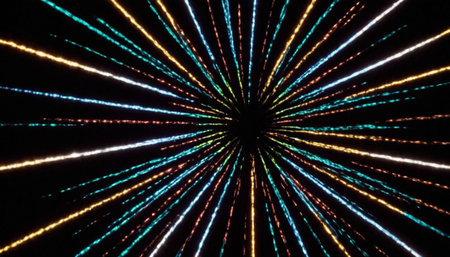 Vibrant colorful light streaks burst outwards from a central glowing point against a dark background.