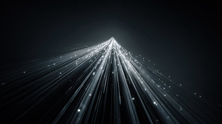 This captivating abstract illustration features glowing light trails and sparkling particles against a dark background, perfect for artistic designs and projects.