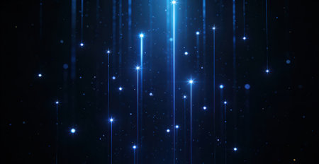 Abstract vertical streaks of light and glowing particles descend against a dark blue background, symbolizing data flow