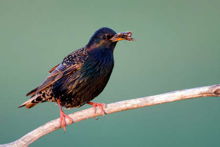 Starling sitting on branch with prey in beak; Common Starling perched on branch with prey in beak