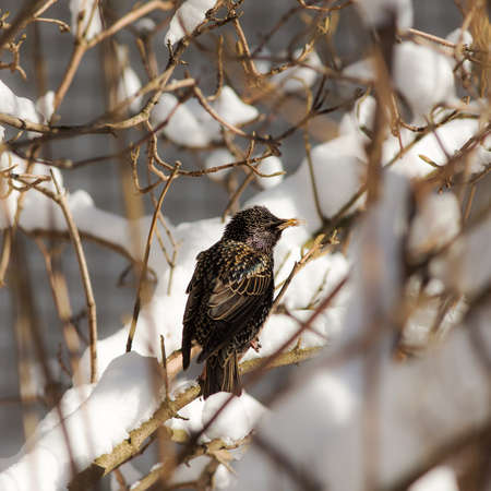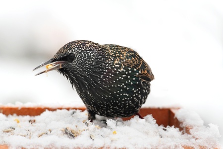 European Starling (Sturnus vulgaris) on a feeder in winter with snow