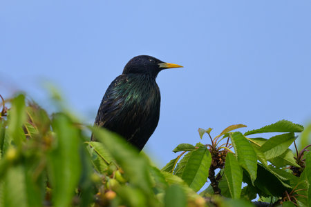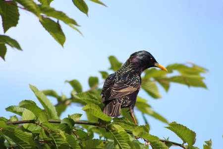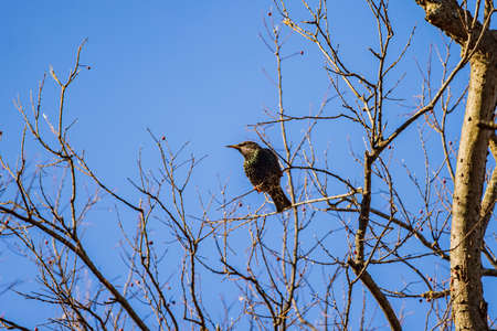 A common starling sitting on a tree, blue sky, sunny day in springtime, Vienna (Austria)