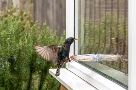 Starling bird, sturnus vulgaris, on window suet feeder with reflection