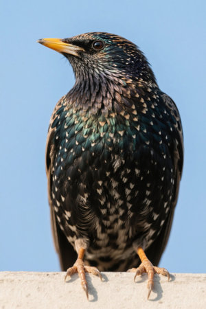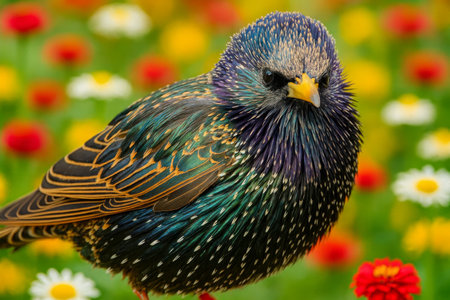 AI-Generated image of a striking European Starling captured in vivid detail. The bird’s glossy plumage shimmers with iridescent greens, blues, and purples, accented by golden-brown feather edges and white speckling.