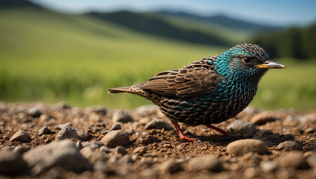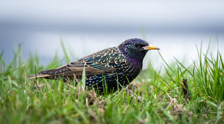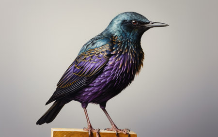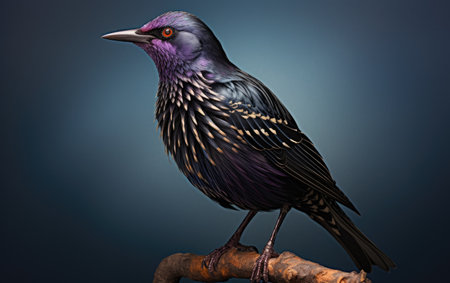 the european starling perches majestically on a weathered wood branch, its iridescent feathers glistening against a vibrant green background, showcasing its unique plumage in this stunning wildlife photography capture, highlighting the beauty of nature and the art of bird photography. ai generated