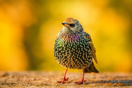 AI-Generated image of a starling bird standing on a wooden surface, captured in sharp detail against a warm golden-yellow background. The bird’s plumage shimmers with iridescent hues of green, purple, and bronze.