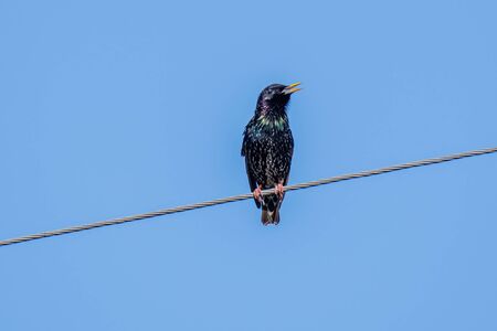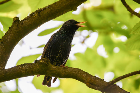 A beautiful common starling nesting in the garden. Starling singing and nesting in the spring. Beautiful spring scenery with a bird.