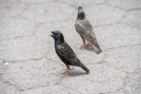 Common starling. European starling. Sturnus vulgaris on ground. Lausanne, Switzerland. Beauty in nature.
