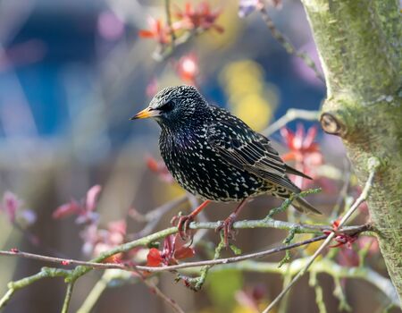 Common Starling (Stunus vulgaris) bird perched on a tree branch which is found in the UK and Europe, stock photo image
