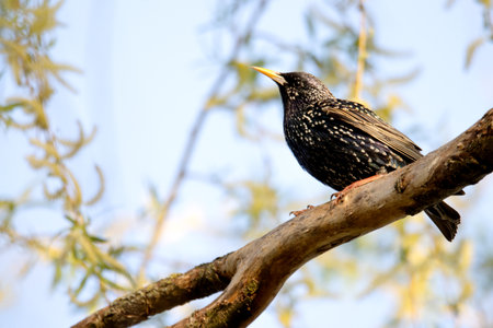 Beautiful bird the Common starling sitting on tree branch on blue sky background