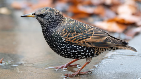 Photograph captures a European starling standing on a wet, paved surface, possibly near a puddle, showcasing its characteristic dark body feathers speckled with small white spots and brown patterned wings. The background is softly blurred, featuring warm, out-of-focus tones suggesting fallen autumn leaves.