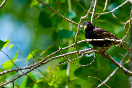 Juvenile Common starling (Sturnus vulgaris) is resting on the branch. Blurry background