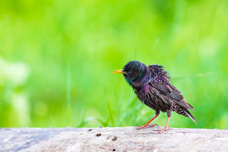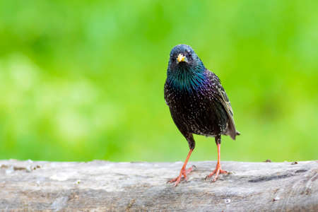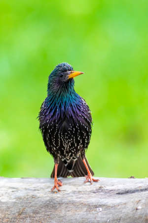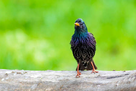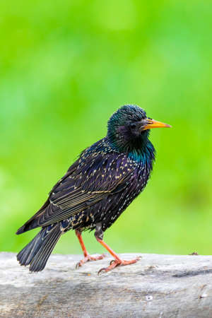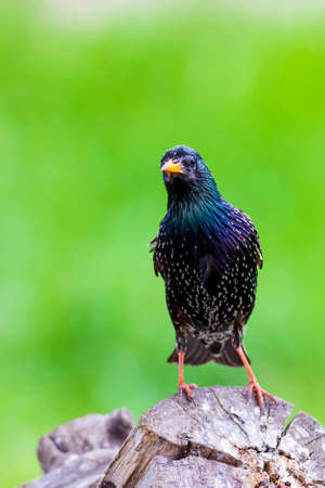 Starling on a tree stump with green background. Starling is a bird in the starling family Sturnidae.