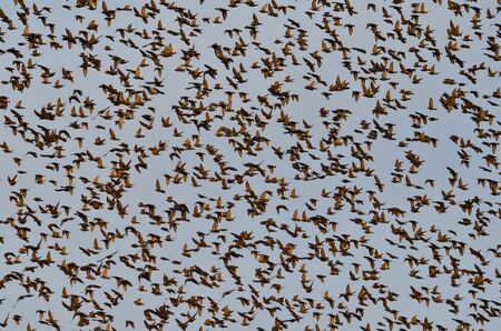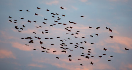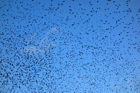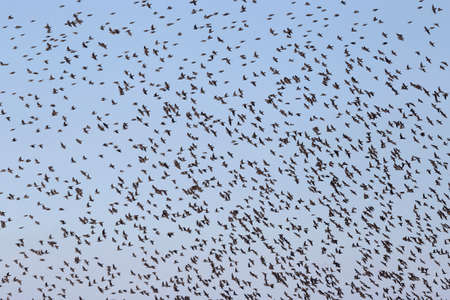 A flock of common starling birds Sturnus vulgaris migration in flight above a meadow