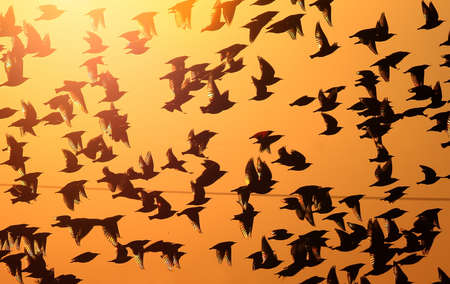 Flock of starlings flying in the sky at sunset. A flock of starlings fly in the sky.